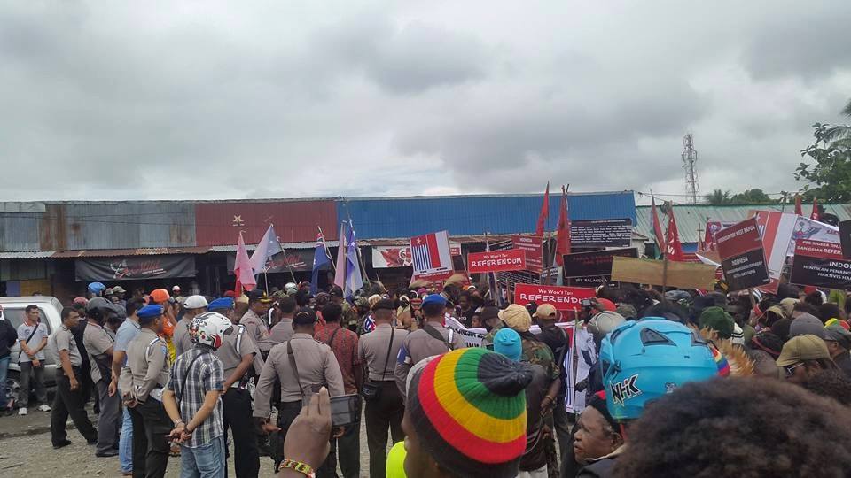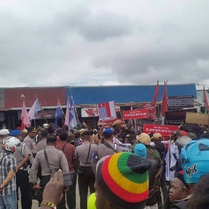 Fully armed Indoensian police confront peaceful West Papuans in Port Numbay (Jayapura) supporting West Papua joining the MSG through the ULMWP0