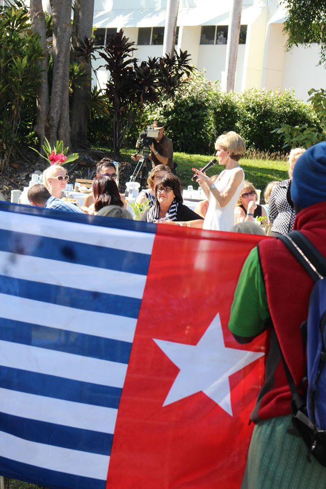 Julie Bishop spoke for a short time then had a few questions from the crowd. She knew I wanted to speak to her but ignored my hand in the air waiting to ask her a question. After she sat down, we walked up to her table peacefully with the morning star flag and asked her if she was going to meet to discuss West Papua. She said to go over to another area and wait, so we did.