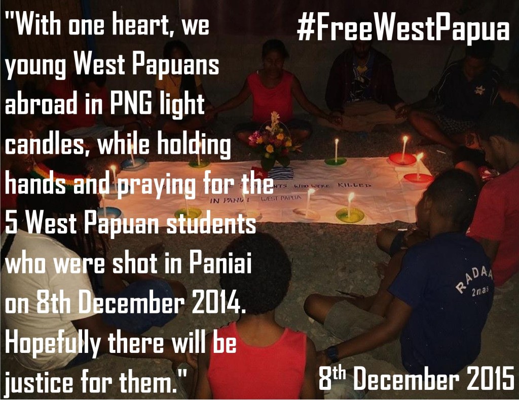 A West Papuan who took part in this Mourning ceremony said “With one heart, we young West Papuans abroad in PNG light candles, hold hands and pray for the 5 Papuan students who were shot in Paniai on 8th December 2014. Hopefully there will be justice for them.”